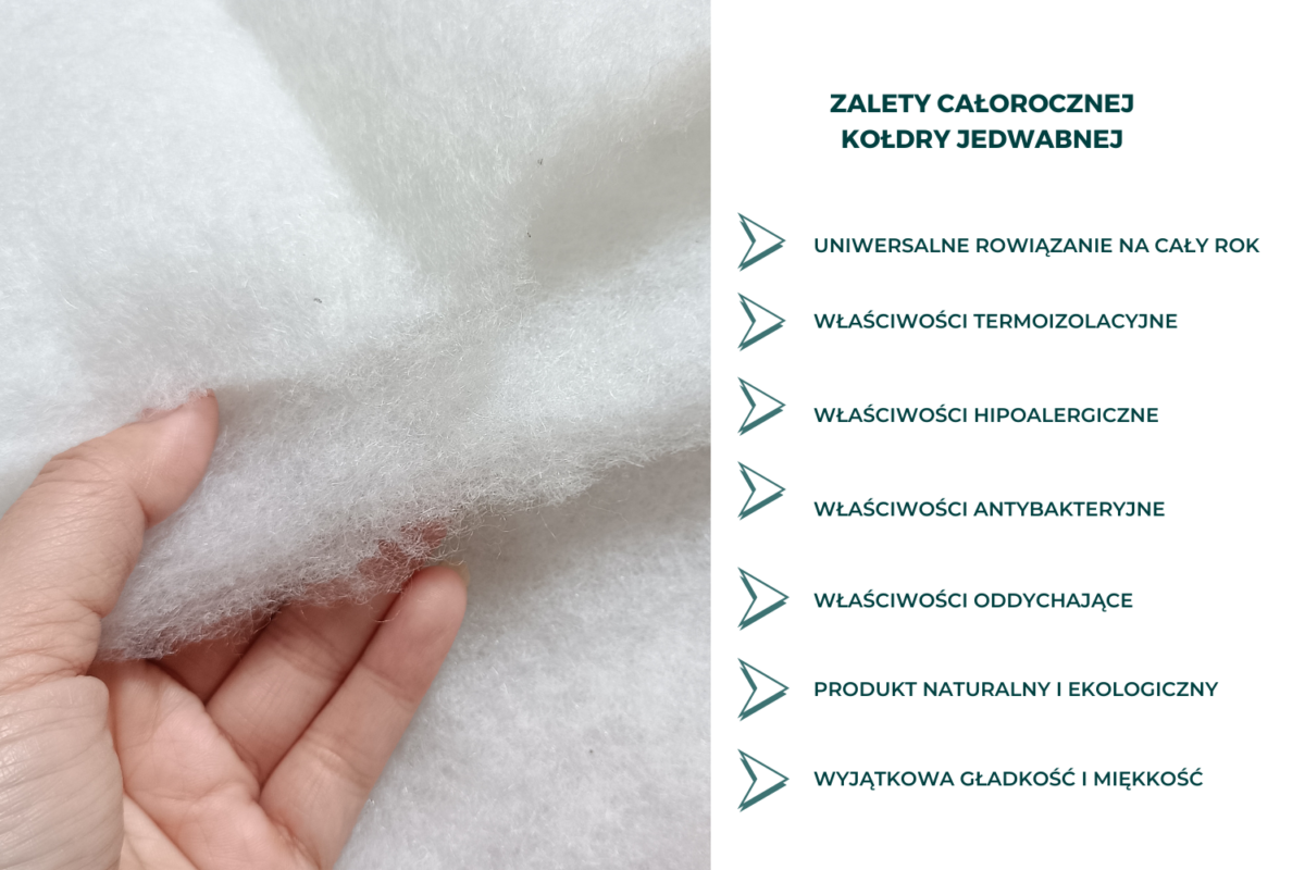 - wysoki komfort termiczny oraz odpowiednia wentylacja, które zapewnia odpowiednie wypełnienie w kołdrze całorocznej.