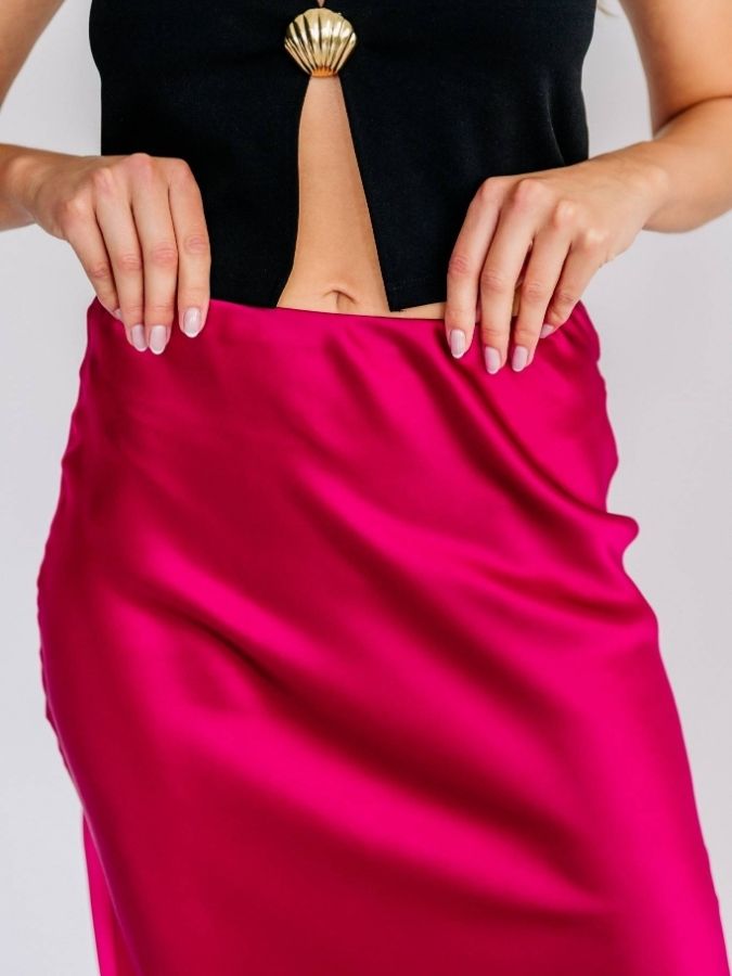 Jedwabna spódnica MIDI, uszyta z najwyższej jakości szlachetnego jedwabiu morwowego, o splocie satynowym. Cięta ze skosu, z krytą gumką w pasie zapewnia doskonałe dopasowanie do każdej sylwetki. Jest idealnym wyborem, jeśli cenisz sobie kobiece fasony, ponadczasową klasykę oraz naturalne tkaniny.