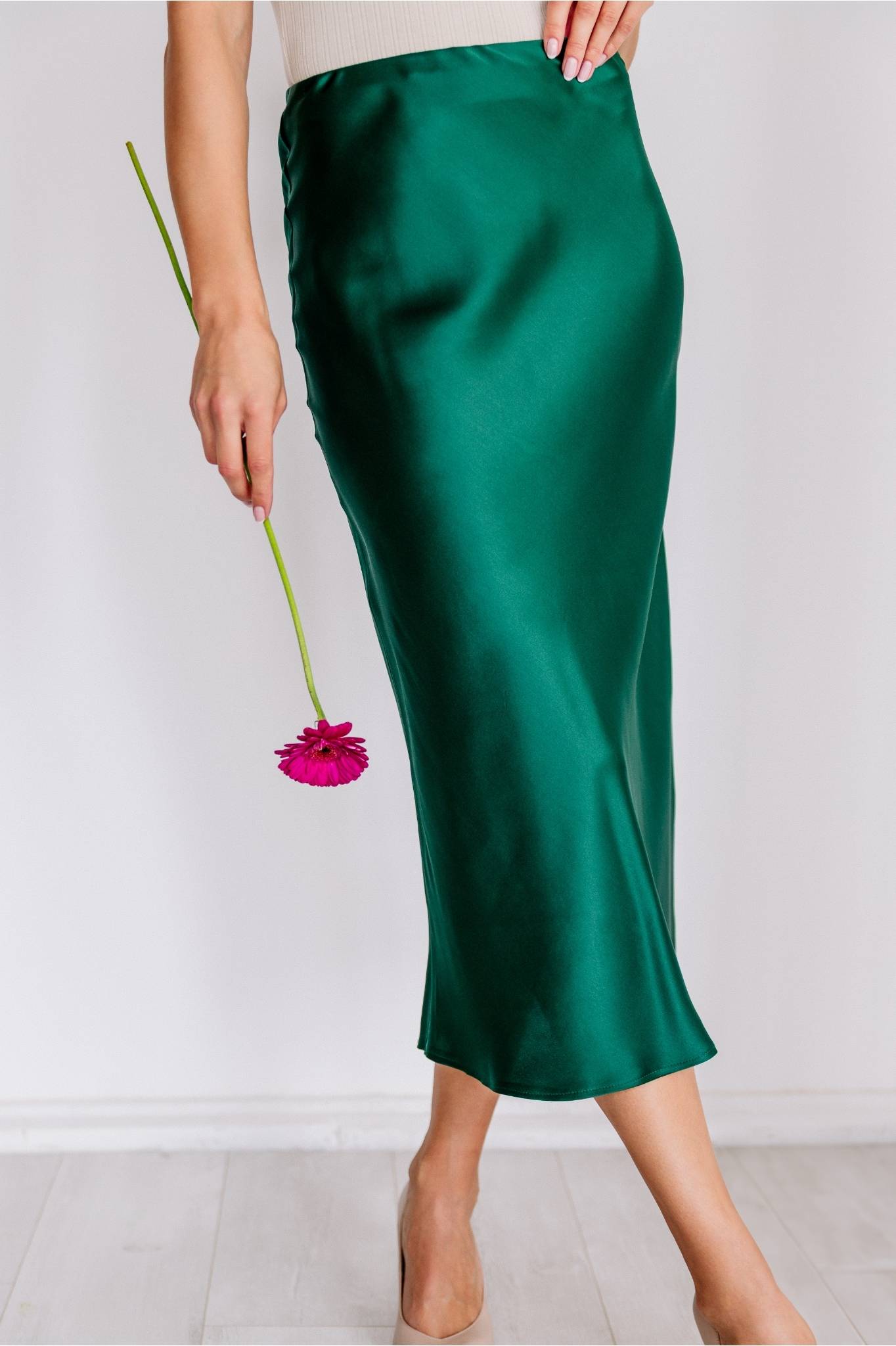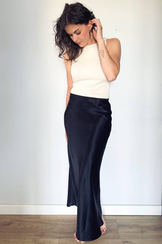 Niezwykle zwiewna, gładka i pięknie lejąca. Delikatnie rozszerza się ku dołowi. Cięta ze skosu, co zapewnia lepsze dopasowanie do sylwetki, a w pasie wykończona krytą gumką dla większego komfortu noszenia. Ponadto 100% jedwabiu naturalnego sprawia, że: